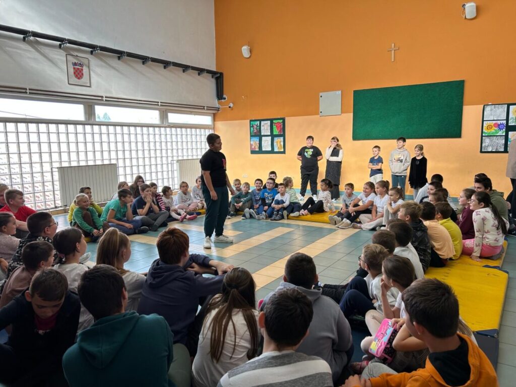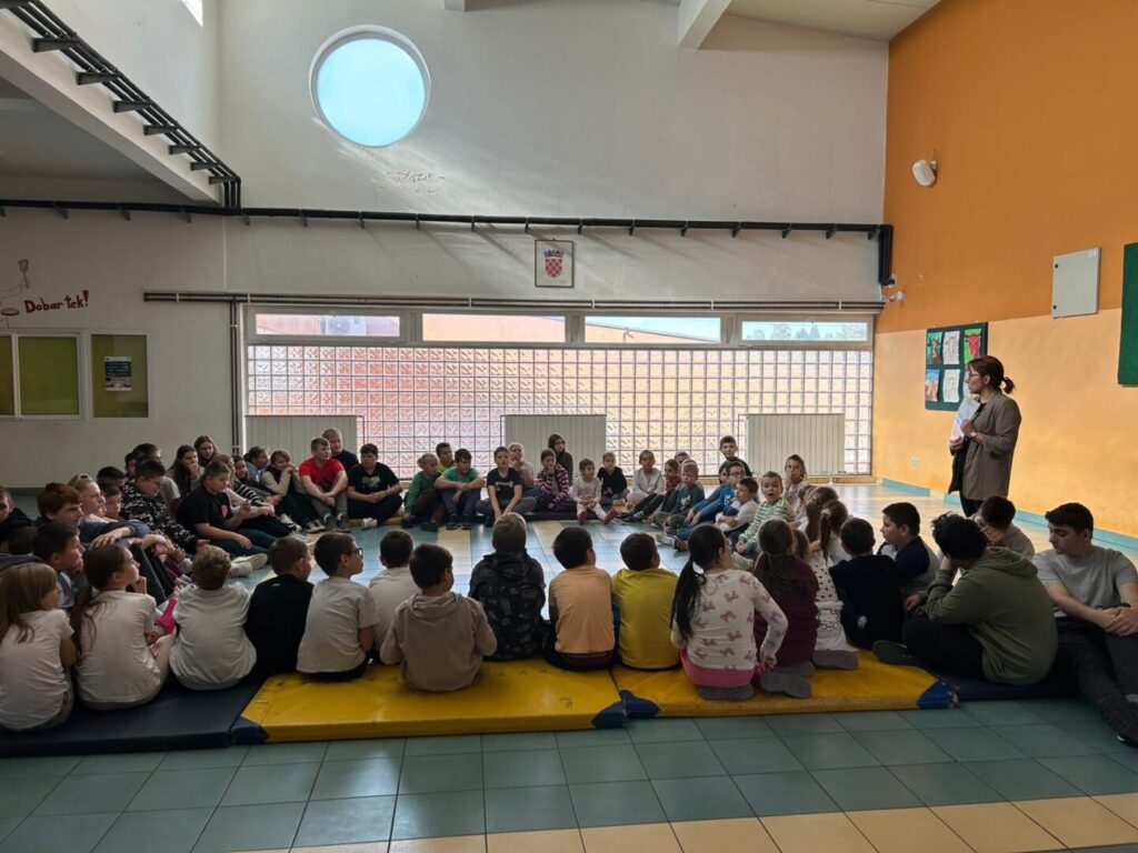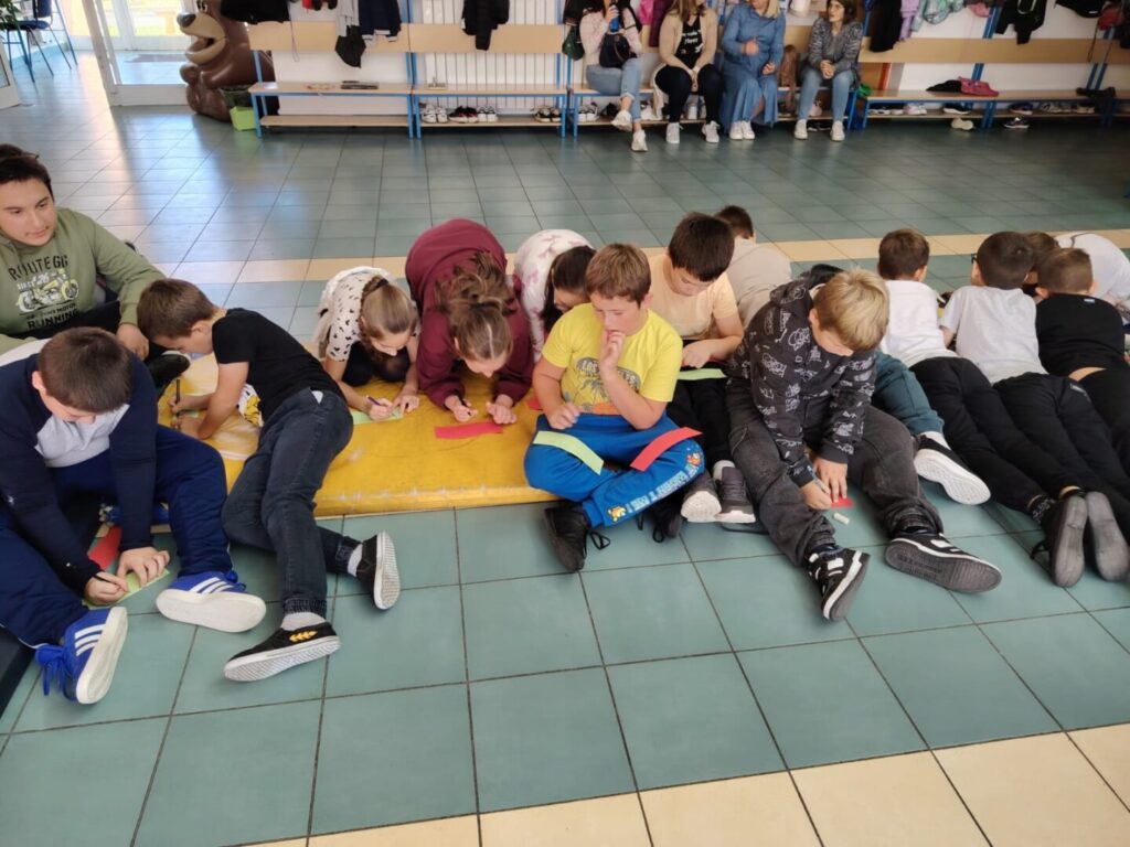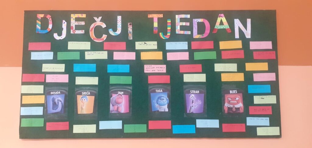 Ove smo godine Dječji tjedan obilježili u srijedu, 8. listopada. Tema su nam bile emocije i to njih 6: dosada, sreća, sram, tuga, strah i bijes. Šest učenika najprije su pantomimom morali pokazati emocije, a ostali su učenici pogađali o kojoj je emociji riječ. Nakon toga razgovarali smo o emocijama. Sljedeći zadatak bio je da svaki/a učenik/ca odabere jednu emociju te na papiru napiše kada se tako osjećao/la. Kad su svi bili gotovi, sve smo emocije s papira pročitali. Učenici/ce bili su jako iskreni pa su nas neke njihove rečenice rastužile, a neke dobro nasmijale. Svidio im se ovakav način obilježavanja Dječjeg tjedna.
