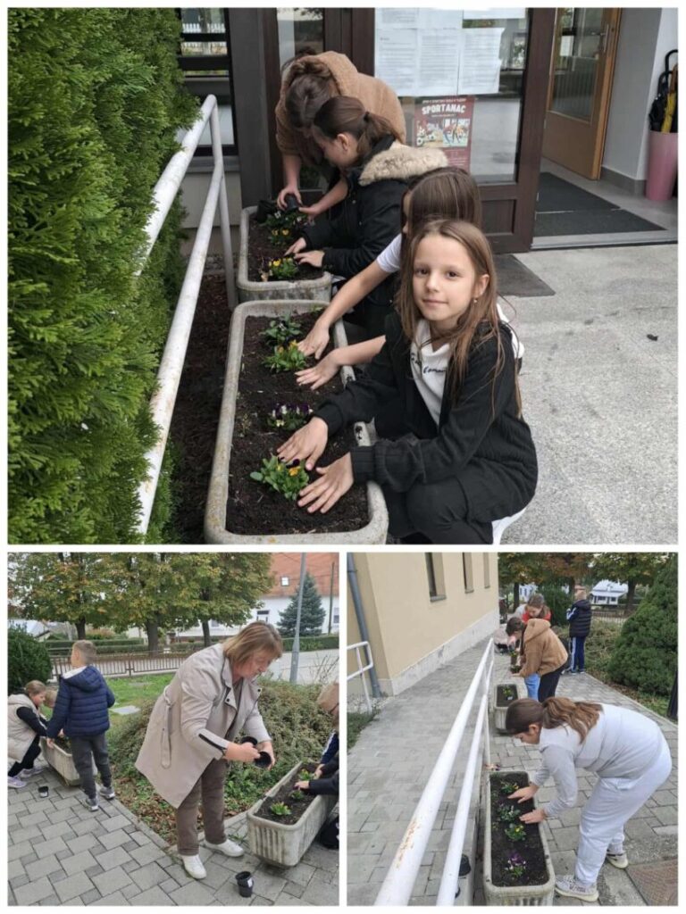 Vrijedni četvrtaši, sa svojom učiteljicom Mirjanom, uredili su školski okoliš sadnjom maćuhica.