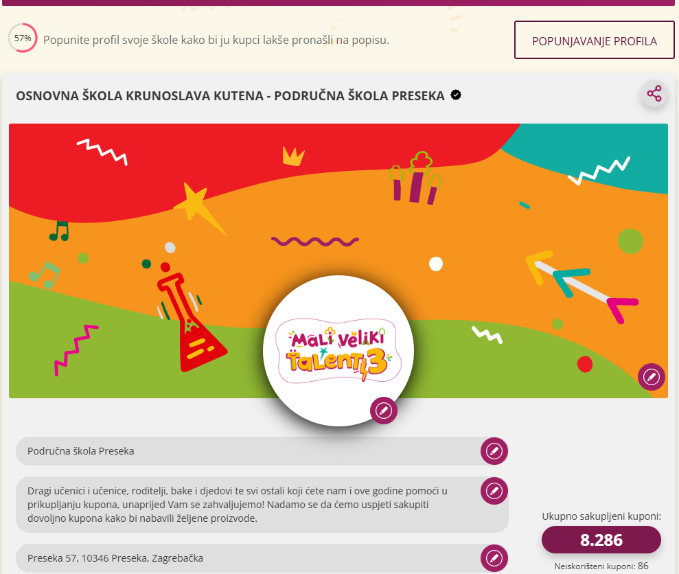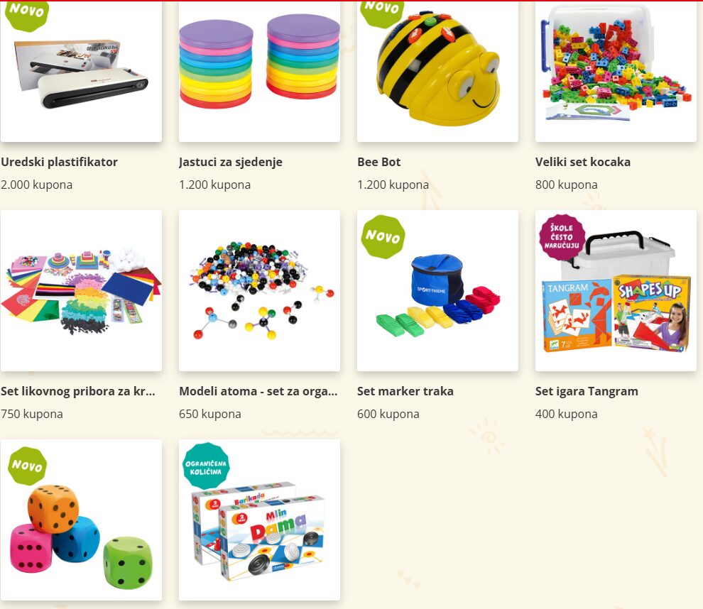Zahvaljujemo svima koji su i ove godine sakupljali kupone za našu školu te nam na taj način omogućili nabavu opreme. Ukupno je bilo sakupljeno 8 286 kupona. I ove smo godine uspjeli naručiti vrlo korisne stvari i jedva čekamo da nam stignu. Naručili smo sljedeće stvari: