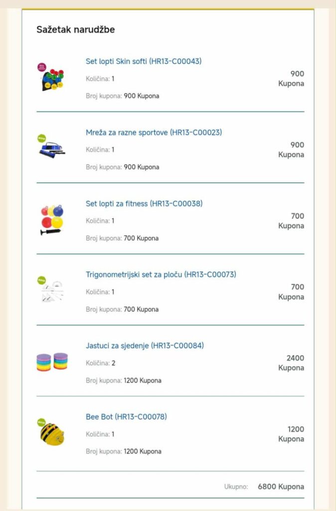 Veliko hvala svima koji su sakupljali kupone za našu školu i omogućili nam da nabavimo opremu koja će poboljšati nastavu: lopte, mrežu, jastuke za sjedenje, trigonometrijski set i robotića.