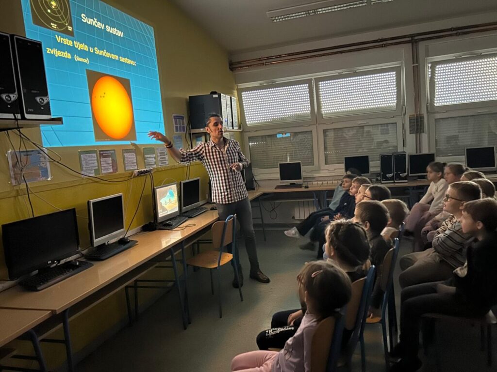 Najprije su imali predavanje – kratku prezentaciju o Sunčevom sustavu, planetima, Sunčevom zračenju te važnosti Sunca za život na Zemlji. Slijedilo je objašnjenje pojmova poput zenita, horizonta, smjerova (sjever, jug, istok, zapad). Iznosili su mišljenje o razlici između gledanja neba danju i noću te kako se prepoznaje Sunce na nebu. Obzirom da nas vrijeme nije najbolje poslužilo, nisu uspjeli vidjeti Sunce kad su izašli iz učionice.