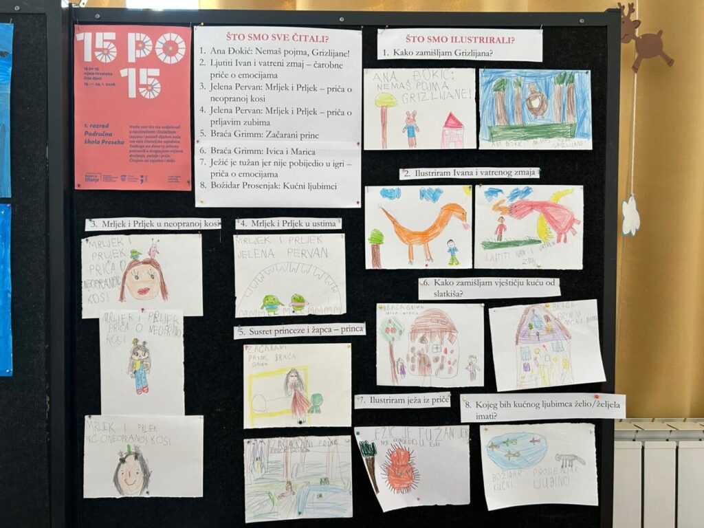 Učenici 1. razreda naše područne škole uključili su se u Nacionalni čitalački izazov „15 po 15: cijela Hrvatska čita djeci“. Izazov je počeo 15. siječnja 2026. godine, s ciljem stvaranja trajne navike zajedničkog čitanja diljem Hrvatske. Izazov se provodio u okviru Nacionalnog programa Rođeni za čitanje.