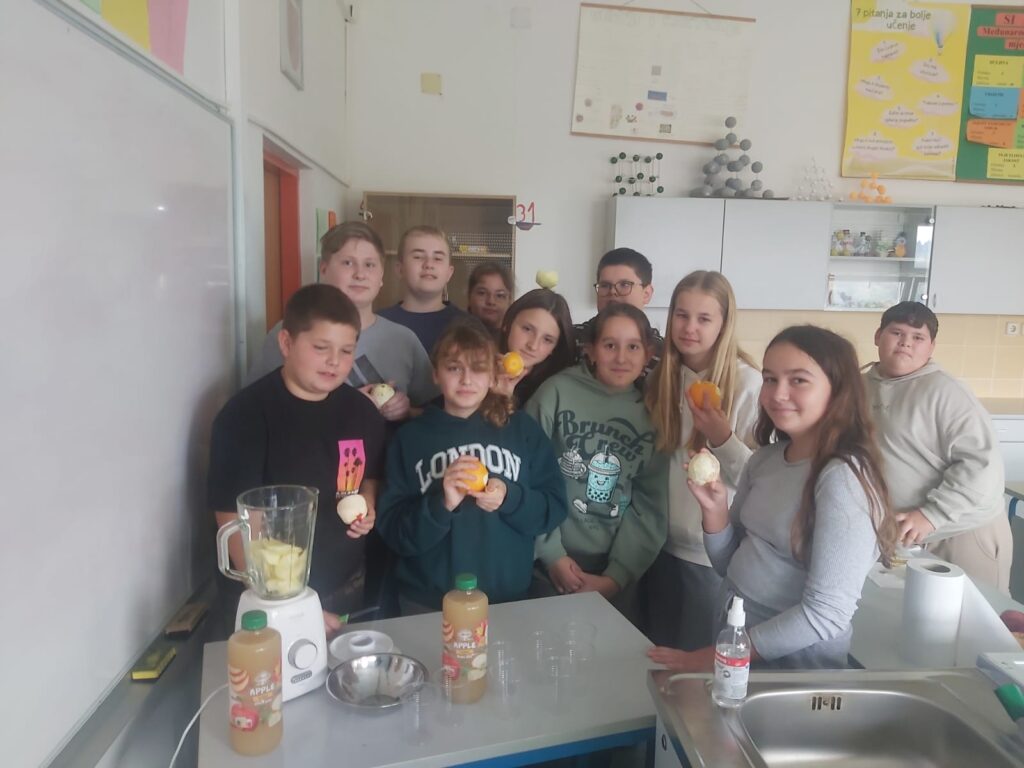 Učenici 6. razreda naše škole taj su dan obilježili tako što su radili smoothie od jabuke na satu razrednika. Prvašići su imali zadatak donijeti u školu jabuke koje su, nakon što smo o njima pričali, bojali te izrezivali različite listiće i ukrasili pano, mogli i pojesti.